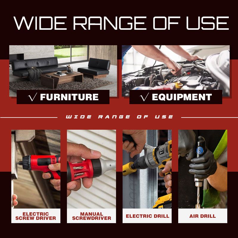 A szabványos 1/4 hüvelykes hatlapú csatlakozó alkalmas pneumatikus csavarhúzókhoz, elektromos csavarhúzókhoz, pneumatikus fúrókhoz, elektromos fúrókhoz, kézi fúrókhoz stb. Ideális autók, motorkerékpárok, kerékpárok és bútorok javításához, valamint bútorok és berendezések egyszerű javításához és szétszereléséhez.