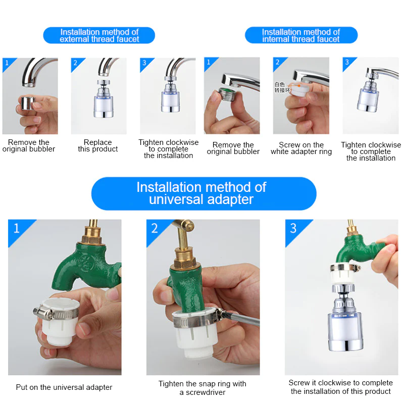 A legtöbb csaptelephez alkalmas, a vĂz kivezetĆ ĂĄtmĂ©rĆje több mint 1,4 cm Ă©s kevesebb mint 2,3 cm lehet. MosdĂłkhoz, fĂŒrdĆkĂĄdakhoz, konyhĂĄkhoz, mosĂłkonyhĂĄkhoz Ă©s hĂĄtsĂł udvarokhoz alkalmas.